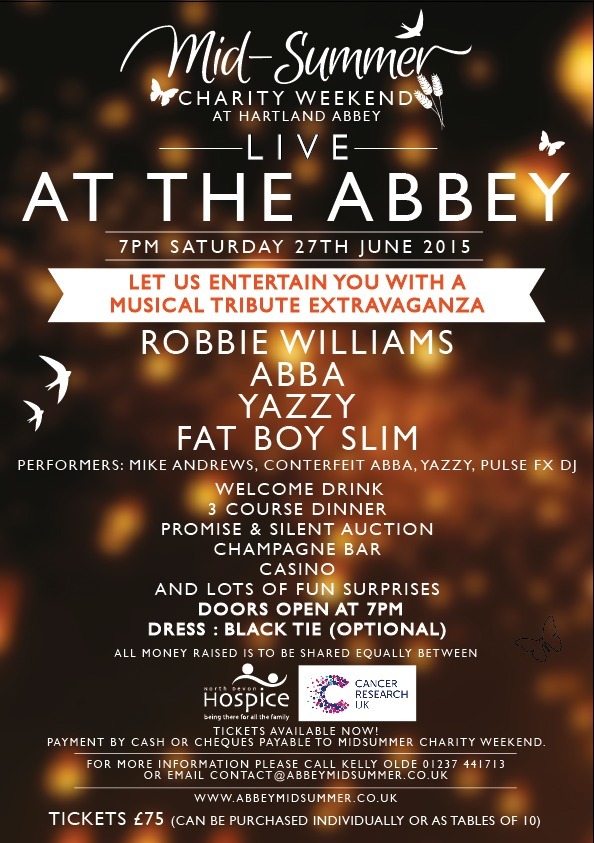From 7pm to 1am on Saturday 27th June be royally entertained by live original and tribute acts: Robbie Williams, Abba, Yazzy and Fat Boy Slim (performers Mike Andrews, Conterfeit Abba, Yazzy and Pulse FX DJ) and enjoy the welcome drink, 3 course dinner, promise and silent auction, champagne bar, casino and lots of fun surprises.